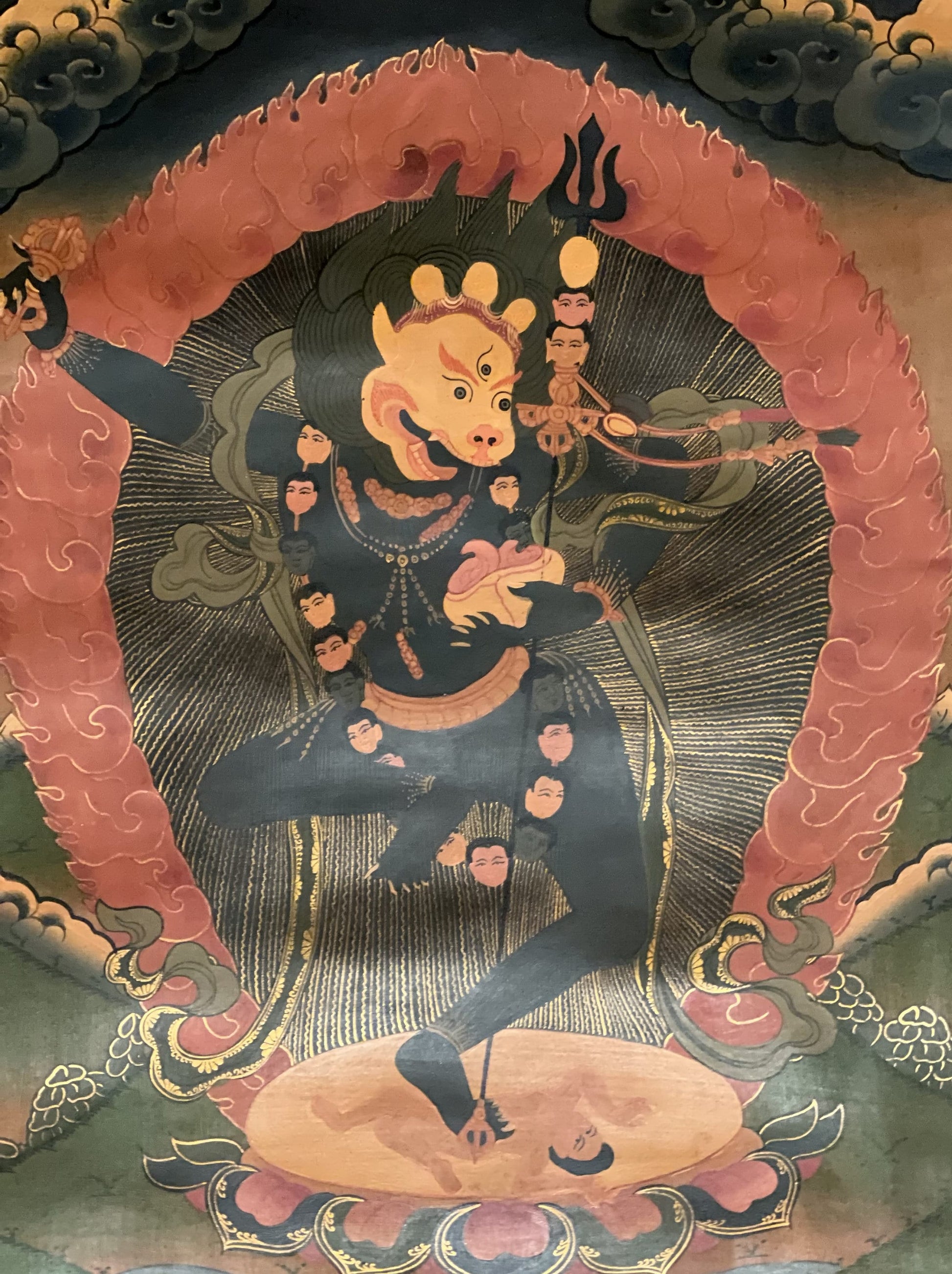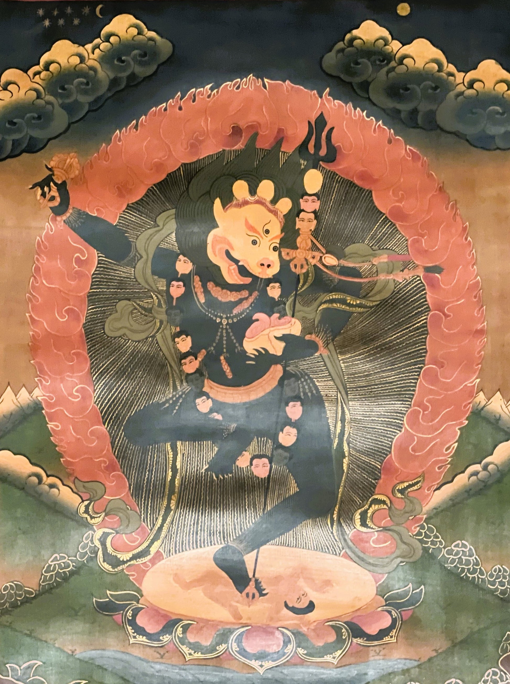 Simhamukha Vajrayogini Thangka represents a powerful and significant deity in Tibetan Buddhism. Simhamukha, or the Lion-Faced Dakini, embodies a wrathful yet enlightened form, depicted in an oil-varnished thangka, which is a unique style of traditional Buddhist art characterized by its use of oil-based paints and varnish.