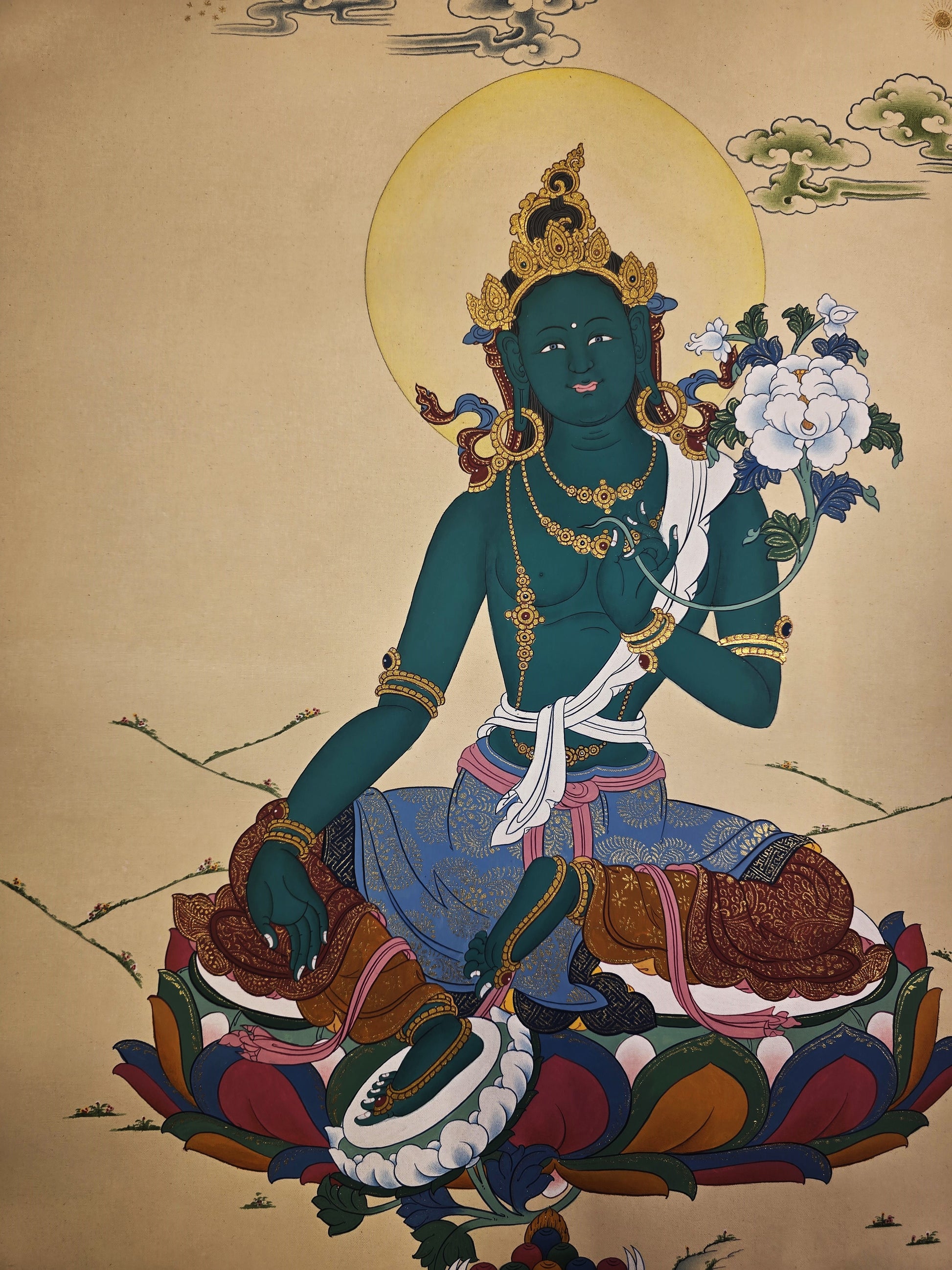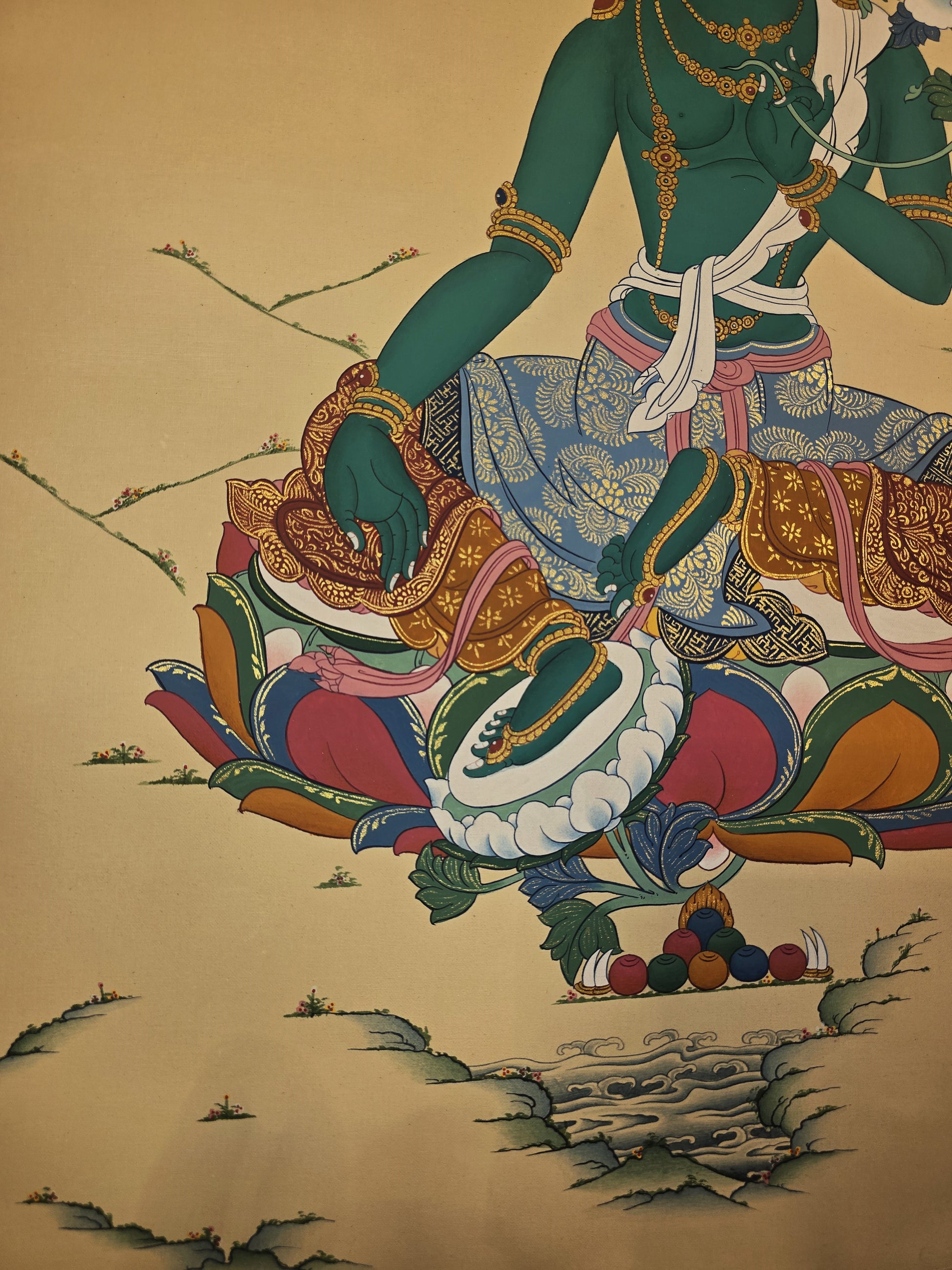 Green Tara Thangka – Hand-Painted Tibetan Artwork in Karma Gadri Style